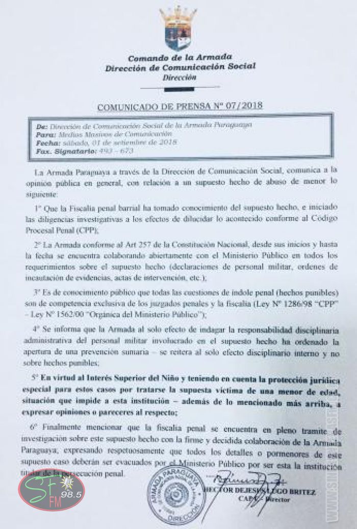 Por último, la institución militar concluyó que no emitirá opinión o parecer sobre este caso por tener en cuenta el interés superior de la niña, de solo 13 años. “La Fiscalía penal se encuentra en pleno trámite de investigación (...) Todos los detalles o pormenores de este supuesto caso deberán ser evacuados por el Ministerio Público por ser esta la institución de la persecución penal”, finalizó el comunicado.