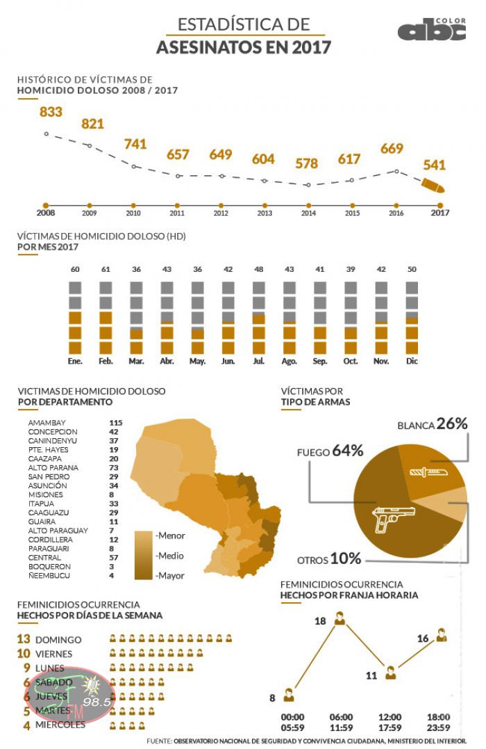El departamento de Amambay sigue siendo, como en años anteriores, la zona con más casos de homicidios en Paraguay, según un estudio realizado por el Observatorio Nacional de Seguridad y Convivencia Ciudadana, dependiente del Ministerio del Interior. En el año 2017, Amambay registró 115 asesinatos, seguido por Alto Paraná, con 73 casos, y Central, con 57.