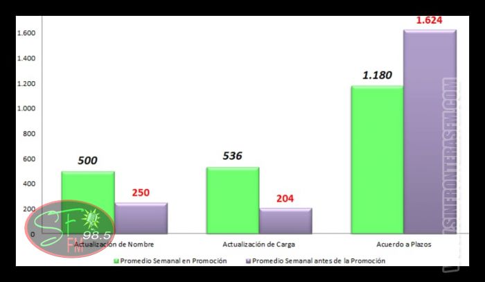 Al realizar un comparativo de estos ítems, durante la vigencia de la Promoción “Ponéte al Día con la ANDE” y antes de la misma, se observa que los promedios semanales de las operaciones de Actualización de Nombre y Carga, aumentaron entre el 100% y el 145%.