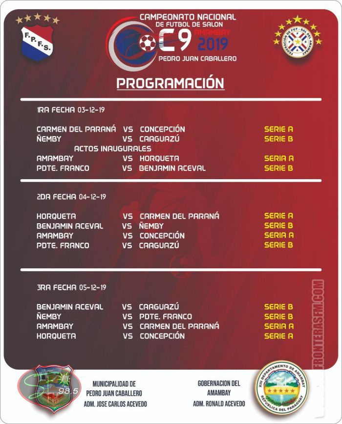 Luego, jugarán Ñemby vs. Caaguazú (B). A las 21:00 se prevén los actos inaugurales y luego prosiguen los juegos con estos cotejos: Amambay vs. Horqueta (A) y Presidente Franco vs. Benjamín Aceval (B).