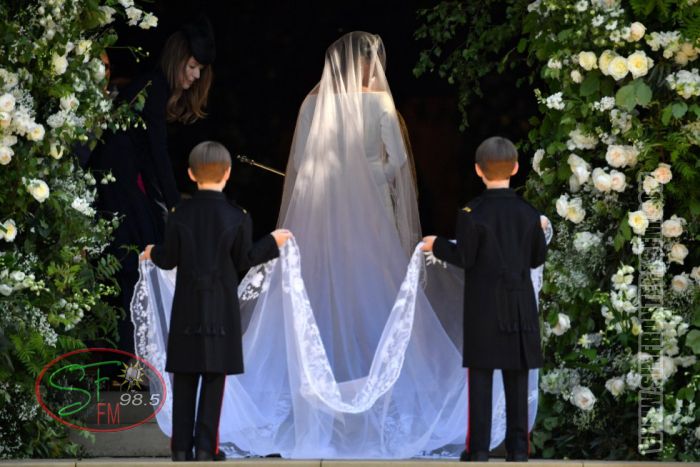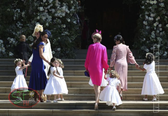 La prometida de Enrique, entró sola en la capilla acompañada por diez niños que hacen de damas de honor y pajes, entre ellos el príncipe Jorge y la princesa Carlota, hijos de los duques de Cambridge, hasta que el príncipe Carlos, heredero al trono, la tomó del brazo para conducirla hasta el altar.