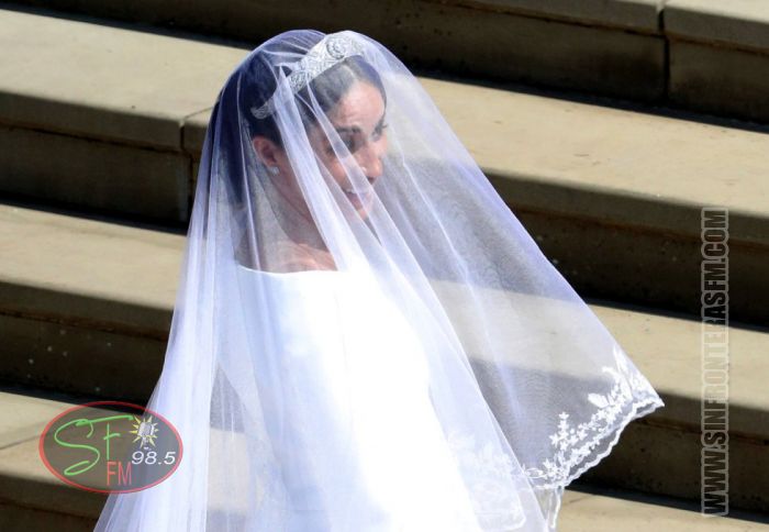 Markle, de 36 años, lleva un elegante y sobrio vestido blanco y un largo velo sujetado por una tiara, que ha sido diseñado por la británica Clare Waight Keller, de la casa francesa Givenchy.