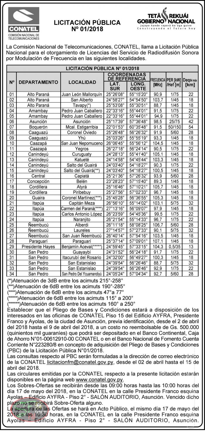 Teresita Palacios, presidenta de la Comisión Nacional de Telecomunicaciones (Conatel), informó que 33 licencias corresponden a estaciones de frecuencia modulada (FM) y las cuatro restantes son para amplitud modulada (AM). La publicación del pliego de bases y condiciones se hace en la fecha. El objetivo de la entidad reguladora es reorganizar el espectro de las radios y a la par regularizar la situación de muchos propietarios.