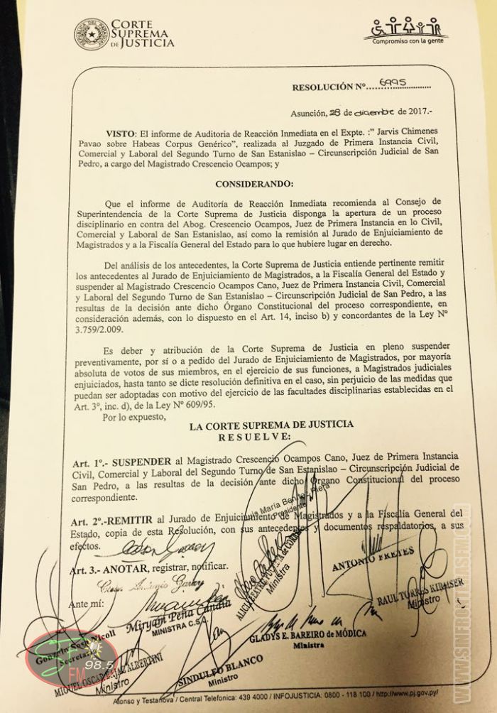 La Corte Suprema de Justicia suspendió en sus funciones al juez Crescencio Ocampos Cano de San Estanislao (Santaní), departamento de San Pedro, que había firmado una sentencia judicial para frenar la extradición de Pavao.
