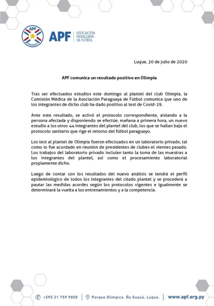 La APF comunicó la detección de más de 50 casos positivos entre integrantes de los planteles del 12 de Octubre (el más afectado), Guaraní y San Lorenzo, por lo que tres partidos quedan suspendidos.