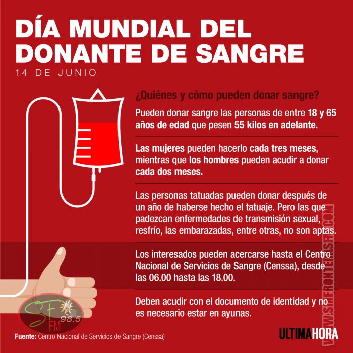 Pueden donar sangre las personas de entre 18 y 65 años de edad que pesen 55 kilos en adelante. Las mujeres pueden hacerlo cada tres meses, mientras que los hombres pueden acudir a donar cada dos meses.