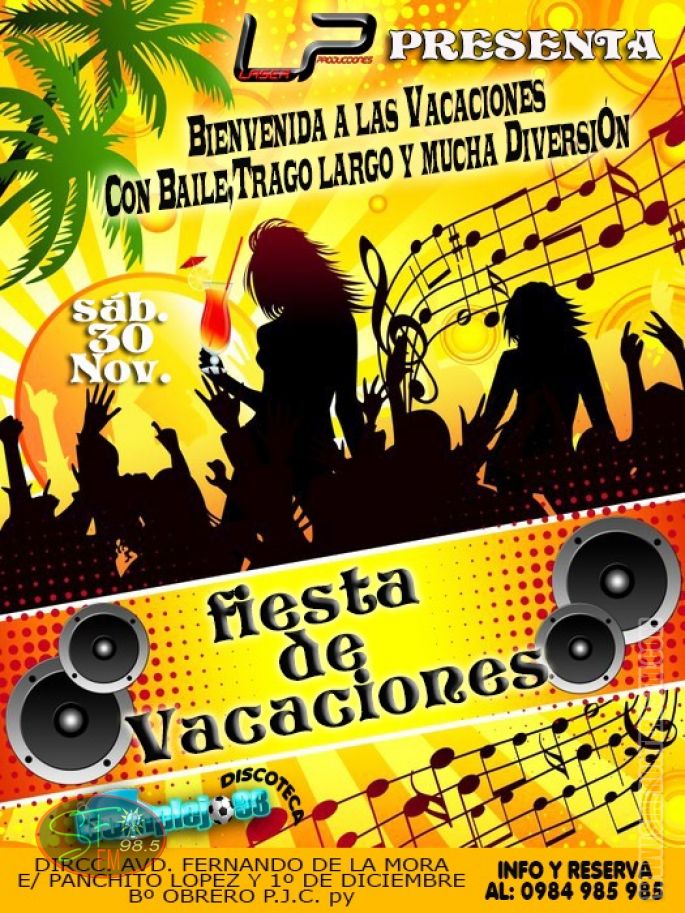 Esta noche para festejar a lo grande el nuevo aniversario de nuestra ciudad y empezar tus vacaciones con mucha buena onda, trago largo, musica y diversión a full. Te esperamos en el Complejo 98 ,con la “Gran Fiesta de Vacaciones otra gran promoción con el sello inconfundible de Laser Produccione.