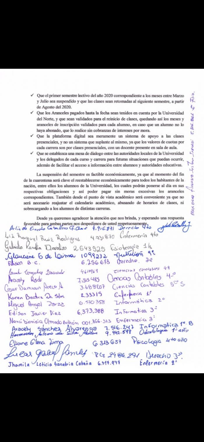 Que los Aranceles pagados hasta la fecha sean tenidos en cuenta por la Universidad del Norte, y que sean validados para el reinicio de clases, quedando así los meses y aranceles de inscripción validados para cada alumno, en caso que un alumno no lo haya abonado, que lo realice sin cobranzas de intereses por mora.