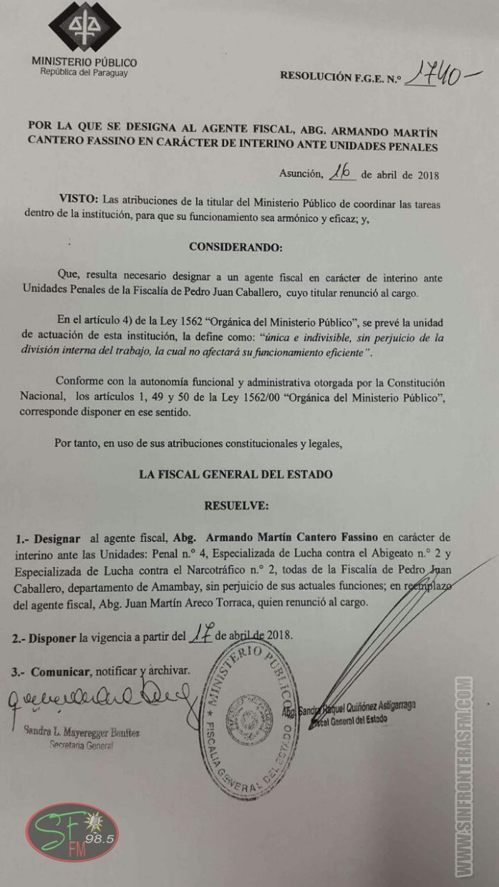 La titular del Ministerio Público, en uso de sus atribuciones constitucionales y legales ha resuelto designar al abogado ARMANDO MARTÍN CANTERO FASSINO en carácter de interino de las Unidadesː Penal N° 4, Especializada de Lucha contra el Abigeato N° 2 y Especializada de Lucha contra el Narcotráfico N° 2, todas de la Fiscalía de Pedro Juan Caballero, departamento de Amambay, sin perjuicio de sus actuales funciones; en reemplazo del agente fiscal JUAN MARTÍN ARECO TORRACA, quien renunció al cargo.