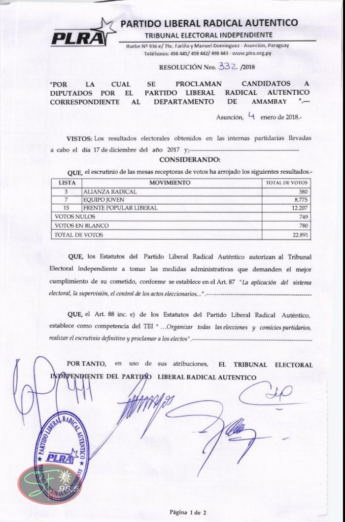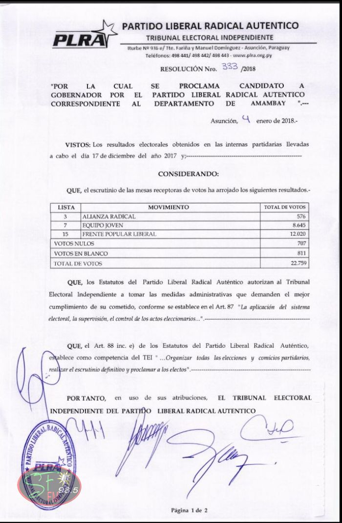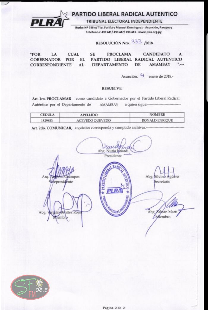 Según la resolución Nº 332 emitida ayer, en horas de la noche, por los integrantes del Tribunal Electoral Independiente (TEI), Acevedo se impuso con un total de 12.207 votos para el Frente Popular Liberal (Lista 15) que lo postuló.
