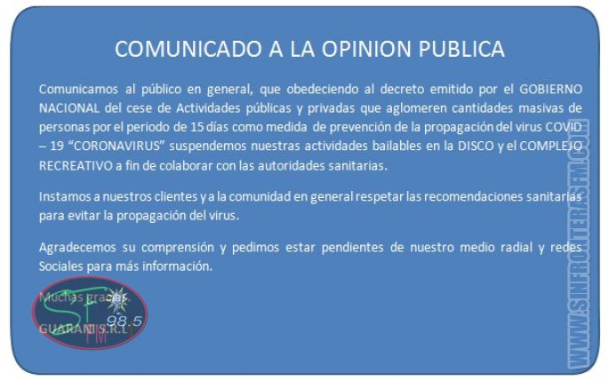 PEDRO JUAN CABALLERO. Ante la declaración de Pandemia del Corona Virus (COVID-19), por la Organización Mundial de la Salud (OMS), y de conformidad a lo establecido por el Poder Ejecutivo mediante Decreto N° 3.442/2.020, que obliga a todos los Organismos y Entidades del Estado, a proteger y promover la salud como derecho fundamental inherente a todo ser humano, el Gobernador de Amambay, Ronald Enrique Acevedo, en uso de sus atribuciones, que le faculta la Carta Orgánica Departamental, mediante Resolución N° 076/2.020, dispone la implementación de medidas preventivas dentro de la institución, por un período de 15 días contados a partir del 18 de marzo del año 2.020