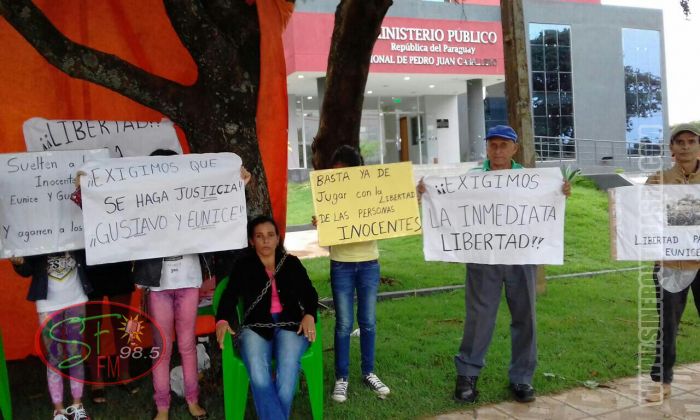 Olga Valdez, madre de Gustavo Alberto Iturbe Valdez y suegra de Eunice Ojeda Sánchez, detenidos por la presunta vinculación de un hecho de secuestro del niño Pedrinho, se encadenó frente al local de Ministerio Público de nuestra ciudad.