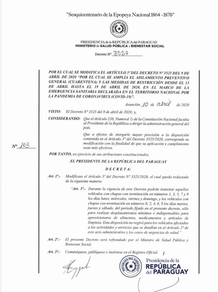 Finalmente, el presidente de la República, Mario Abdo Benítez modificó este viernes el artículo 3ro. del Decreto 3525, sobre la cuarentena por pandemia del Covid-19, que se extiende hasta el 20 de abril.