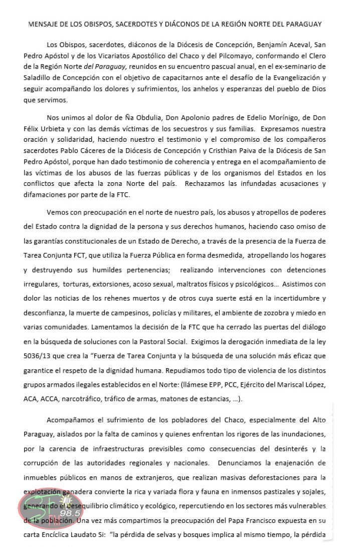 Por otra parte, repudiaron la violencia de los grupos armados como el EPP, PCC, Ejército del Mariscal López, ACA, narcotráfico, tráfico de armas, matones de estancias, entre otros.