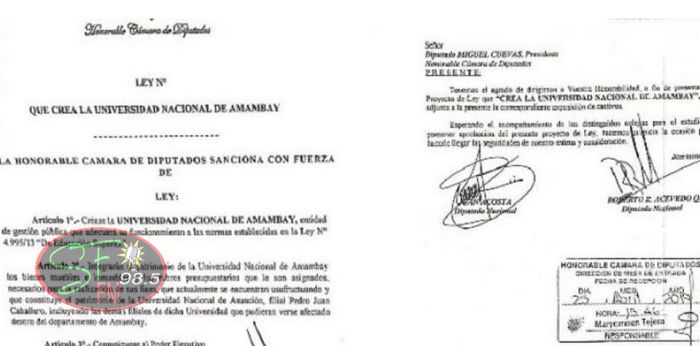 Los diputados nacionales Juancho Acosta y Robert Acevedo, representantes de nuestro departamento ante la Cámara de Diputados, presentaron conjuntamente un proyecto por la cual de creación de la Universidad Nacional de Amambay. Con la iniciativa se pretende la habilitación de más carreras universitarias para brindar más oportunidad en la formación académica de los jóvenes de Amambay