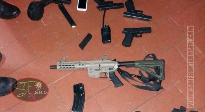 Alrededor de las 13:30 los investigadores divisaron salir de la casa un automóvil de la marca Kia Soul, color blanco, por lo que decidieron interceptarla. Tras la revisión del vehículo hallaron dentro un fusil de asalto AR-15 calibre 5,56 mm, además de cuatro pistolas Glock calibre 9 milímetros con sus respectivos cargadores y chalecos antibala.