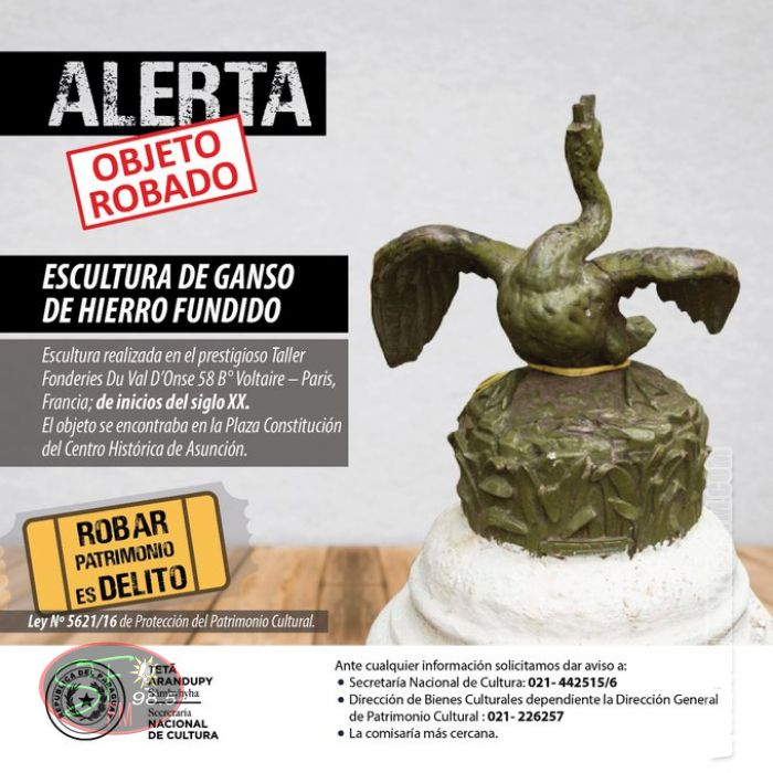 La Secretaría Nacional de Cultura (SNC) emitió una alerta tras comprobar que la obra, conocida como “El Ganso”, no se encontraba en la Plaza de la Constitución donde estaba siendo restaurada junto a otras piezas por técnicos de la Dirección General de Patrimonio Cultural.